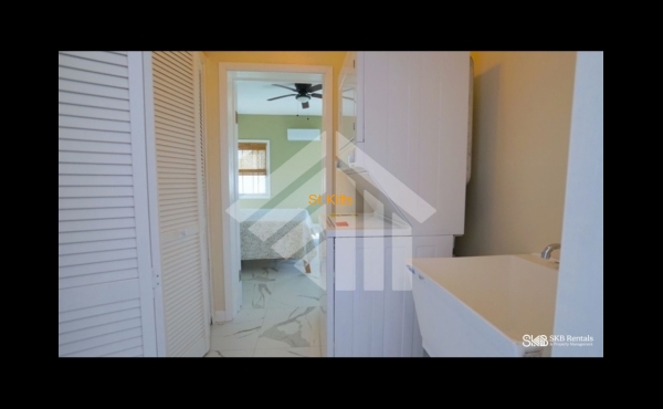 A hallway leads to a practical laundry area equipped with a washer and dryer, along with additional closet stor