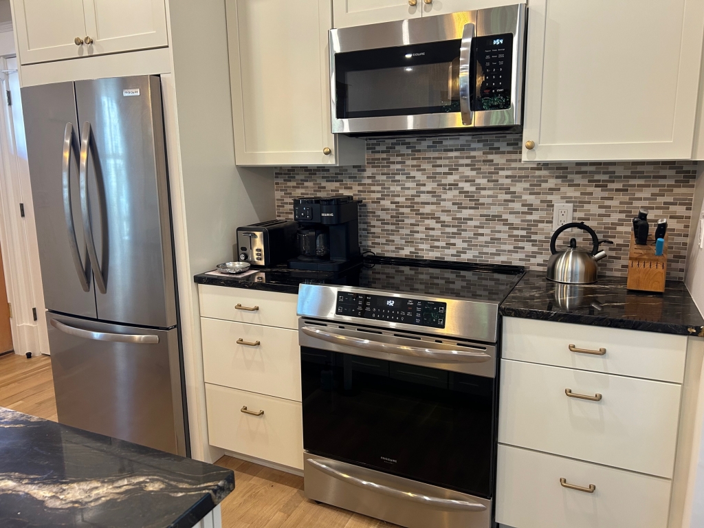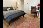 Each bedroom has a queen bed, full bedding, a dedicated work space, closet and dresser. Standing shower, washer dryer in unit. Kitchen fulled stocked with plates, pots etc. Free on street parking.