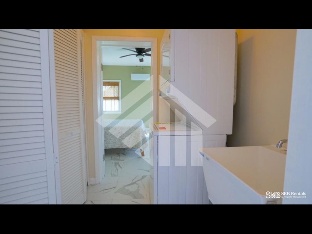 A hallway leads to a practical laundry area equipped with a washer and dryer, along with additional closet stor
