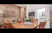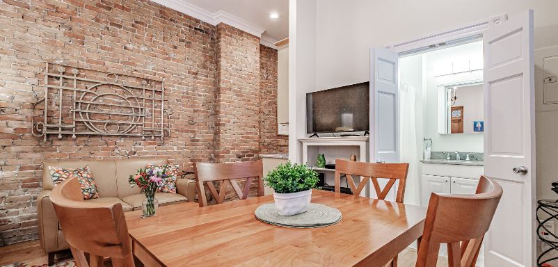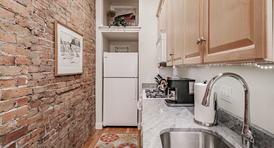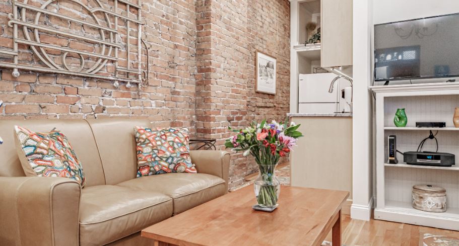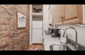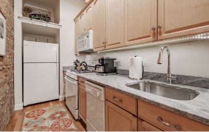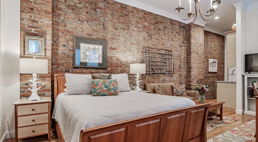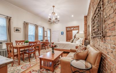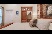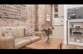 This lovely studio apartment in downtown Portland features richly patterned fabrics, colorful Company C rugs and an exposed brick wall that all combine to create a sophisticated and comfortable take on urban living.The fully applianced gallery kitchen has everything you need and is outfitted with granite countertops and natural maple wood cabinetry. Light floods this apartment through the spacious windows, tempting you outdoors on to your own private deck. This downtown apartment has everything you need to feel at home.